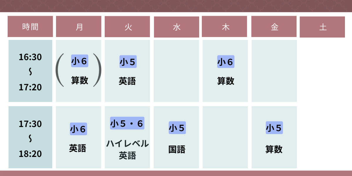 詳細な曜日や時間については、学年・教科により異なりますので、お気軽にお問い合わせください。